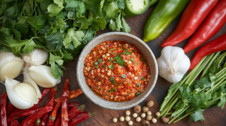 A vibrant bowl of spicy sauce filled with fresh herbs and chili, surrounded by colorful ingredients. Perfect for culinary enthusiasts and food lovers.