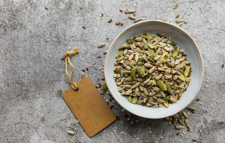 Mix different seeds for a healthy salad, bowl on a gray concrete background