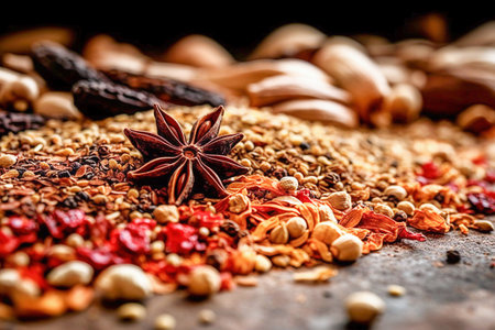 Close-up of scattered spice seeds on dark textured background, showcasing natural colors and fine details, perfect for culinary and food photography.