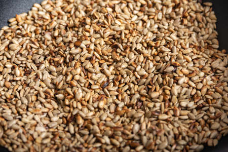 Fried sunflower seeds in a frying pan, peeled.