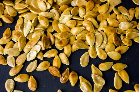 Home cooked pumpkin seeds on black background.