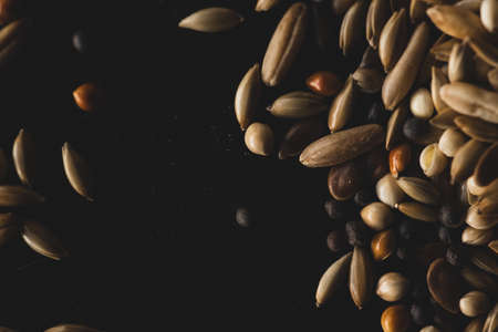 Mixed Bird seeds macro close up, selective focus