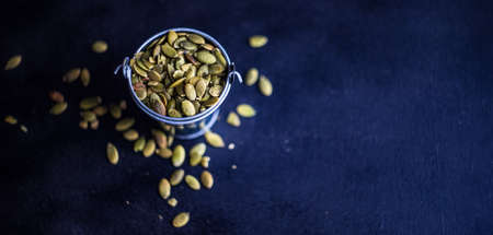 Raw pumpkin seeds as a organic and superfood concept on rustic background with copy space