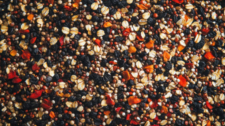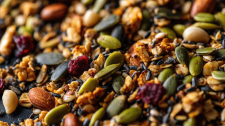 This captivating image showcases a colorful granola mix featuring a blend of nuts, seeds, and dried fruits, perfect for a nutritious snack or breakfast option.