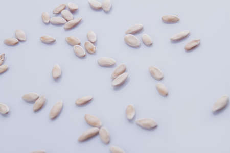 Many brigtht pumpkin seeds scattered around. White isolated background.
