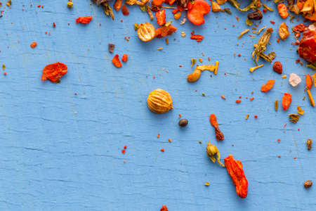 Various colorful herbs and spices on wooden table. Top view of spices and herbs. Spices and herbs over on wooden table background.