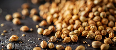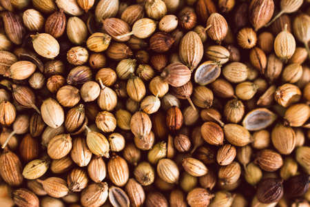 Coriander seeds close-up, texture, food background.
