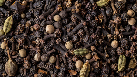 An upclose view of crushed black peppercorns intermixed with whole cloves and cardamom pods. The contrast of the dark and light es creates a visually intriguing image while the differin