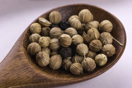 Round coriander seeds on white