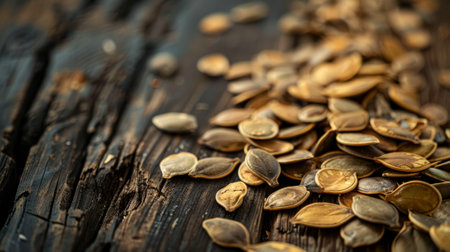A pile of pumpkin seeds on a wooden table. The seeds are scattered in various sizes and shapes, creating a visually interesting and colorful scene. Concept of abundance and natural beauty