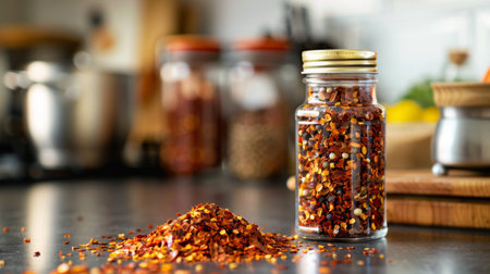 A jar of chili flakes and a grinder of black pepper on a kitchen counter, showcasing essential spices for cooking.