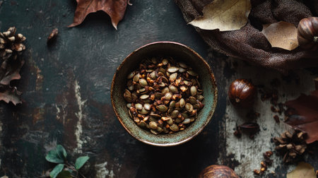 Top view of roasted pumpkin seeds in a small bowl, styled with rustic fall accents and a clean backdrop