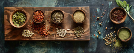 A wooden board featuring a variety of seeds and a wooden bowl, arranged in a rustic and natural style.