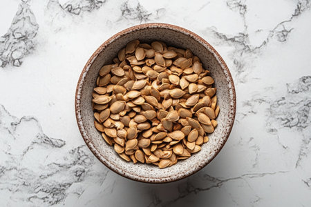 Pumpkin seeds filling a rustic ceramic bowl, placed on a marble surface, creating a warm and inviting scene