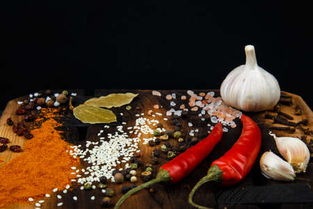 Composition with a cutting board, spices and hot pepper on a wooden background