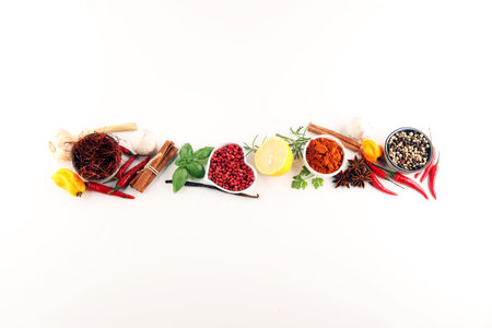 background of various spices on a white background