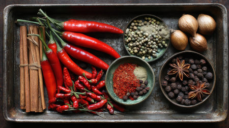A beautiful display of fresh spices and herbs arranged on a rustic tray, featuring vibrant red chilies, aromatic cinnamon sticks, and various spices, ideal for culinary inspiration.