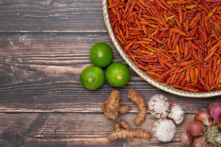 Limes, turmeric, garlic, shallots, dried chilies on wooden table with copy space. Top view, flat lay of Ingredient for making Thai curry paste.