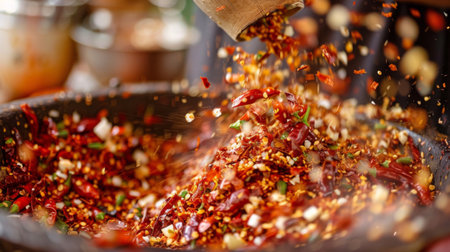 A close-up of chili peppers being crushed into flakes, adding heat and flavor to dishes.