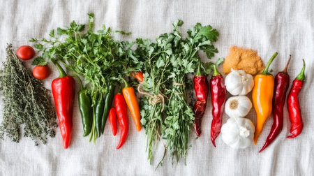 A vibrant arrangement of fresh vegetables and herbs including chilies, garlic, tomatoes, and spices on a rustic cloth. Perfect for culinary inspiration.