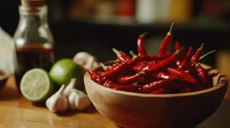 A vibrant bowl of fresh red chilies surrounded by garlic and lime, perfect for adding spice to your dishes. Great for culinary enthusiasts.