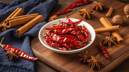 Vibrant red chili peppers beautifully displayed on a wooden cutting board with a sprinkle of spices and fresh herbs, perfect for culinary inspiration.