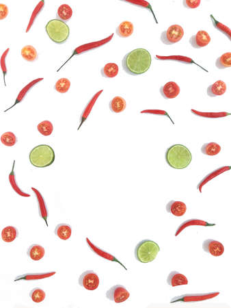 Composition of onion, pepper, tomatoes, lime, lemon isolated on white background, selective focus, flat lay, close-up. Copy space for inscription. Studio shot. Creative composition. Preparation for cooking. Healthy lifestyle concept.