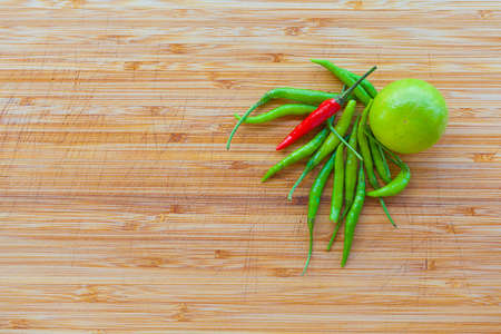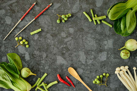Variety of green vegetables pak choi, asparagus, broccoli and birds eye chilli on rustic wooden table.