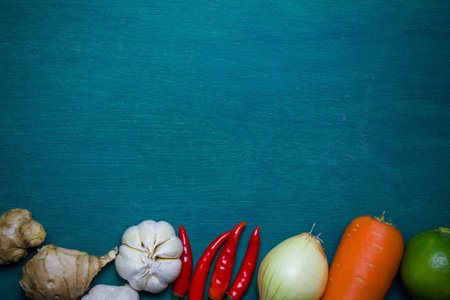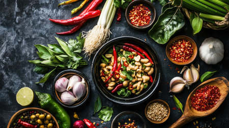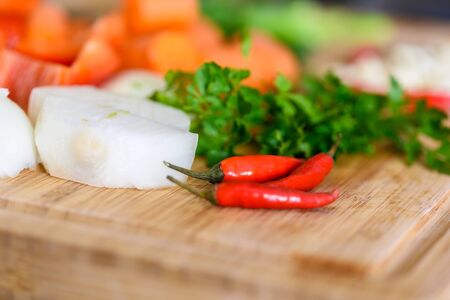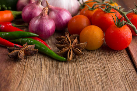 thai kitchen food spice herb pepper red onion garlic for cooking on top wood table