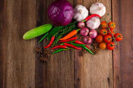 Healthy food herbs Spices for use as cooking ingredients on a wooden background with Fresh organic vegetables on wood. The concept of food ingredients with Variety on the rustic table.