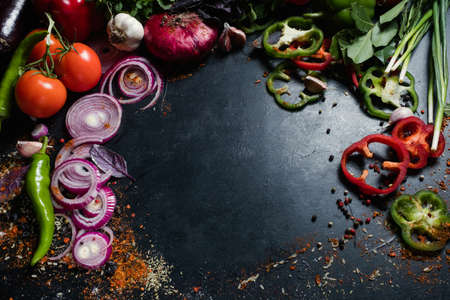 vegetable mix on dark background. Organic food. Vegan healthy eating. Negative space concept