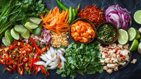oriental cuisine meal salad and vegetable on dark background. wholesome healthy food eating. copy space concept