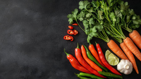 Assortment of fresh vegetables lying down on a dark table, view from above