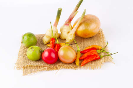 Fresh Ingredients for Cooking Southeast Asian Curry Dish Sauce with Chili Peppers Ginger Lemon Grass Onions Shallots Lime Leaves Garlic Candle Nut Tomato