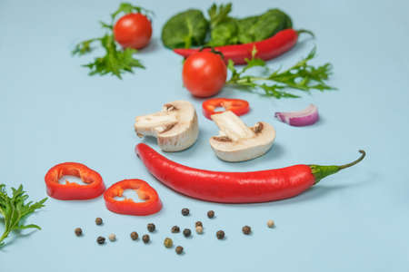 Red chili peppers, tomatoes and green rucola salad leaves on blue background.