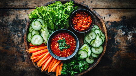 Ripe vegetables ingredients for cooking. Red hot chili peppers, cherry tomatoes, aromatic garlic, allspice peas and lettuce leaves on a wooden background. Culinary background.