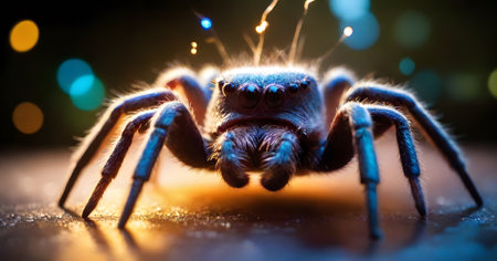 The mesmerizing eyes of a spider radiate with a captivating glow, as it navigates a shimmering environment, a spectacle of natural wonder. AI generation