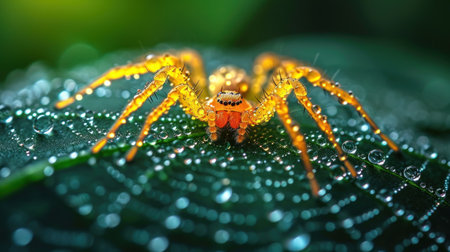A stunning close-up image of a spider resting on its intricate web, adorned with glistening dew drops, showcasing the beauty and detail of nature's craftsmanship.