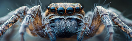 This close-up showcases the remarkable details of a spider's anatomy, highlighting its hairy legs, large eyes, and distinctive mouthparts against a softly blurred background.