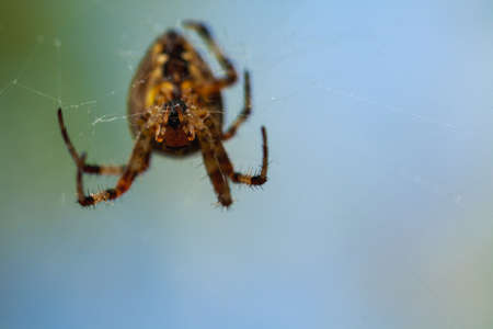 Close up macro shot of a garden spider sitting in a spider web.