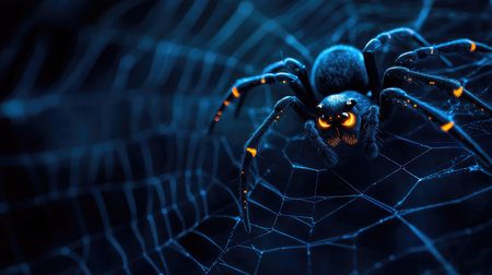 Halloween spider web with a large spider and glowing eyes, dark background, copy space