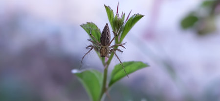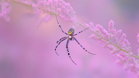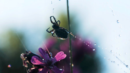 A small spider. Creative. A small spider that is entangled in its spider web and has beautiful purple flowers on the back.