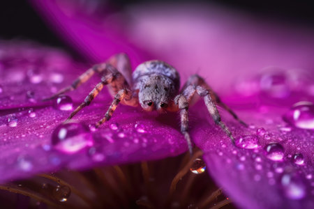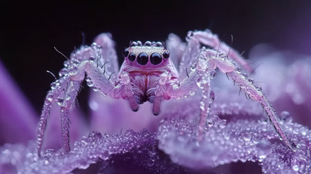 This stunning macro photograph captures a jumping spider adorned with dew drops, perched on a purple flower petal, showcasing the intricacies of nature.