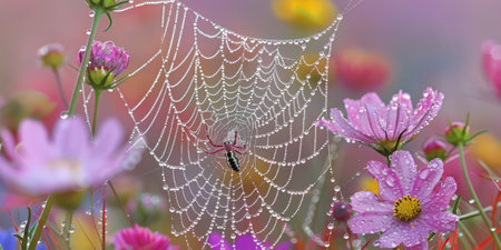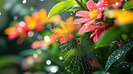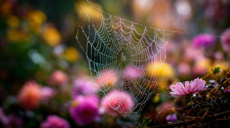 This enchanting image captures a spider web glistening with dew drops amidst a backdrop of colorful flowers, creating a serene garden scene infused with natural beauty.