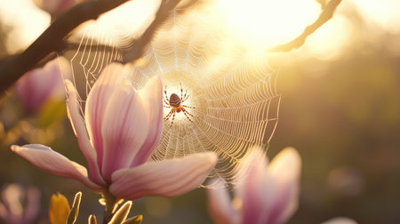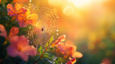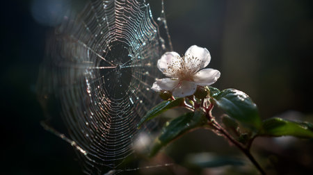 A stunning scene capturing a delicate flower adorned with morning dew, nestled beside an intricate spider web. Sunlight enhances the beauty of nature's details.
