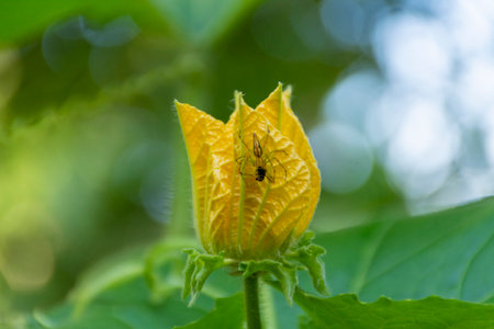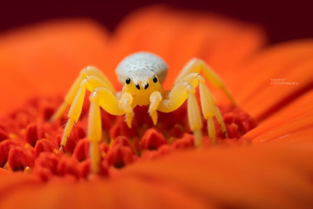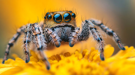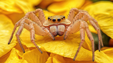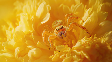 A stunning macro shot of a yellow spider perched on vibrant yellow flower petals. The image captures intricate details of both the spider and the blooming petals, highlighting the beauty of nature. Perfect for themes related to wildlife, gardening, and macro photography.
