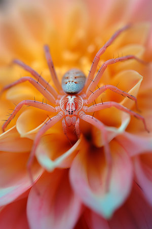 Spider on orange dahlia flower. Macro photography of animals.