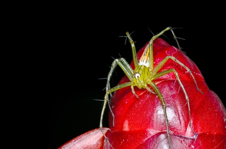 Tiny yellow spider perched on the edge of a red flower on black ground