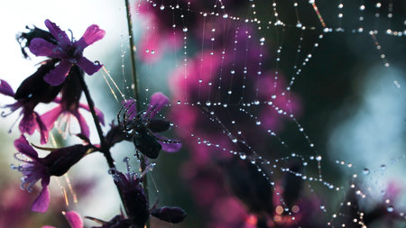 Spider web with dew drops on the flower meadow at sunset.