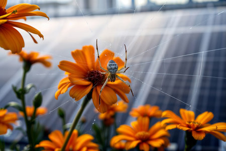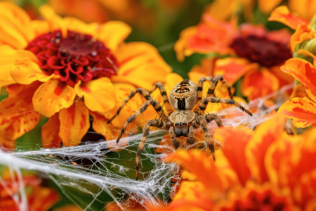 Spider on orange flower. A spider perched on an orange daisy flower against a blurred background, with a web visible.